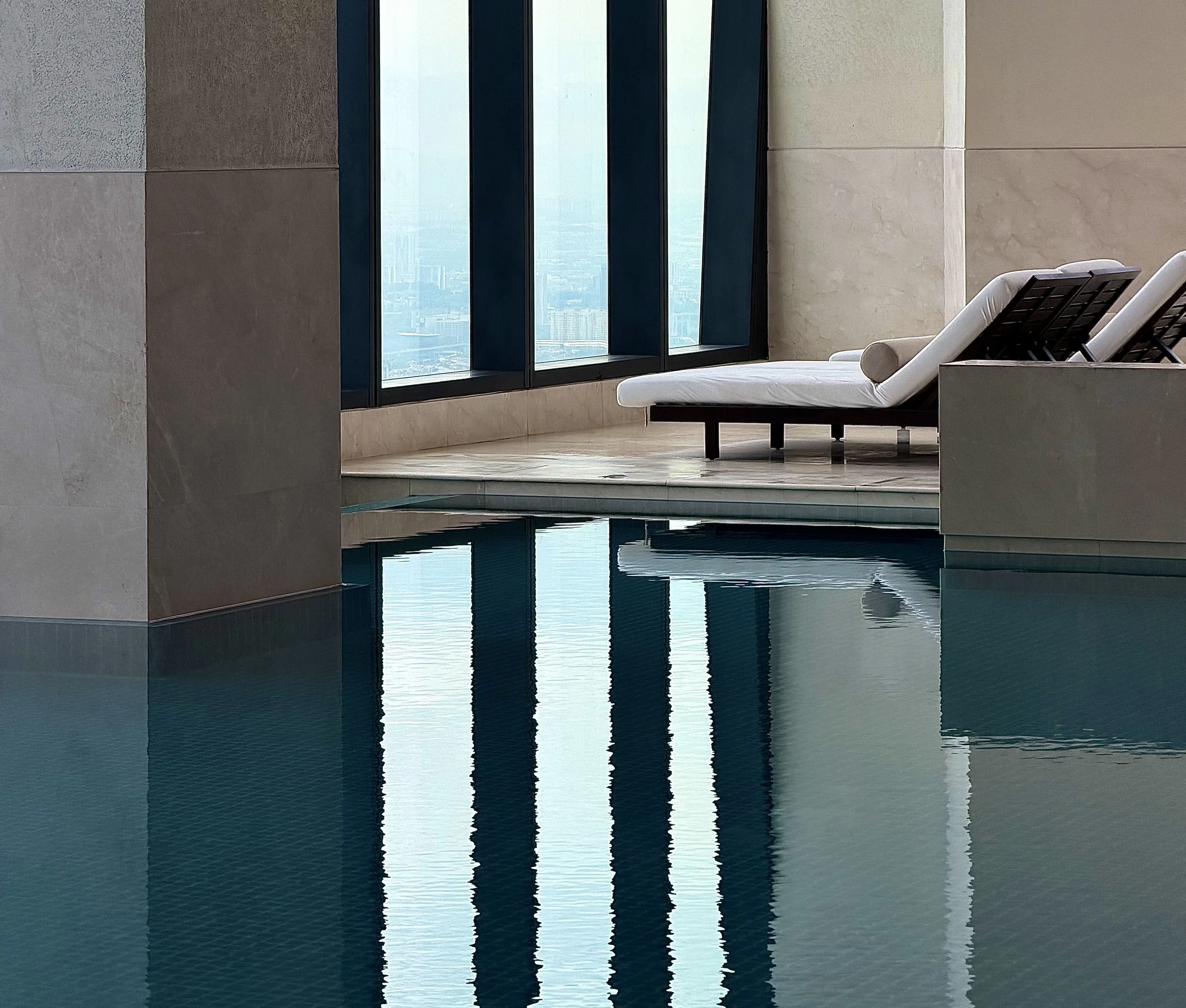 From there, high-speed elevators transport you high above the city to the 75th floor, where a double-height lobby awaits. Here, brass batik screens cast intricate, shifting shadows across warm stonework - a subtle marriage of heritage craft and contemporary artifice. The panoramic windows frame Kuala Lumpur’s skyline, turning the lobby into a permanent observatory of towers, lights, and shifting urban mood.